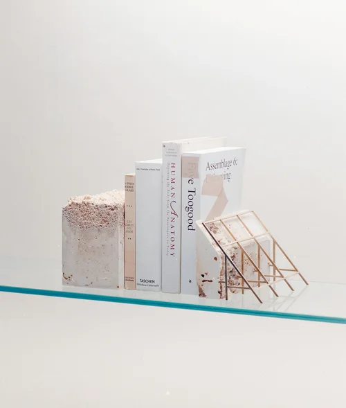 Both separately and together, they are both functional and sculptural. Depending on the position in which they are arranged, they appear as a low table, low stools, minimal shelving, or sculptural pieces.